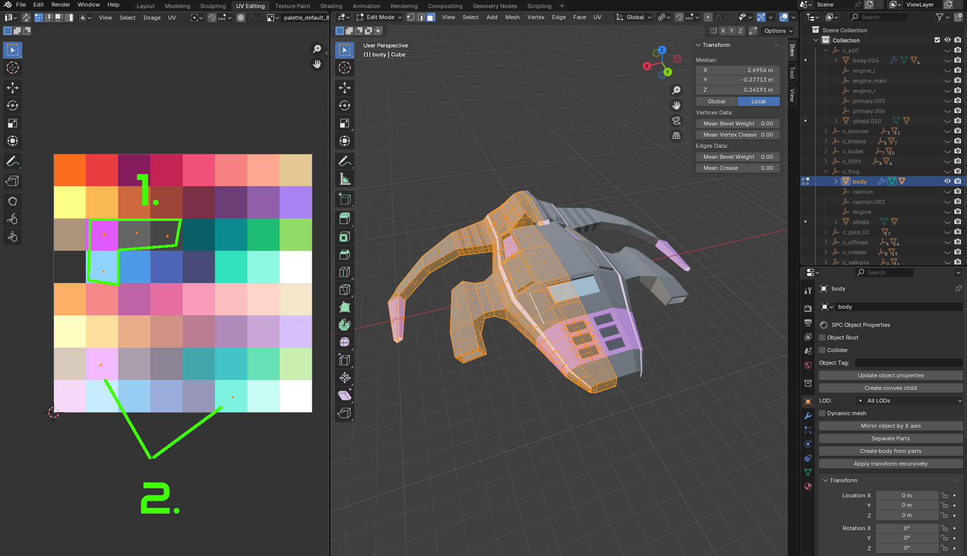 Certain points on the model need to be marked — such as where projectiles and missiles are fired from (“cannon”) and where the engine thrusters are located.